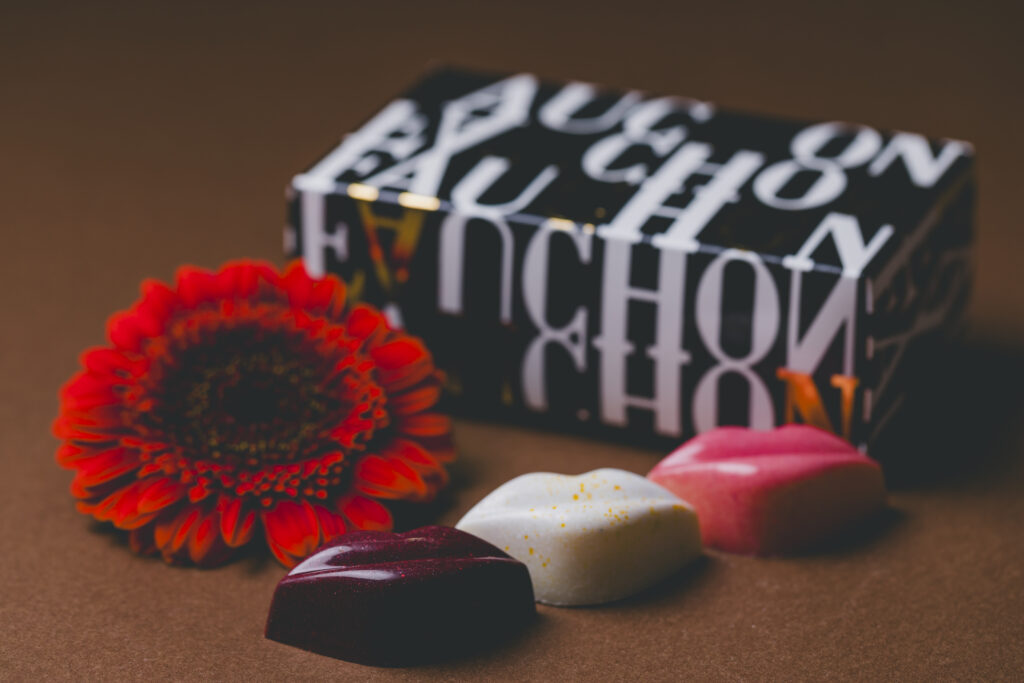 特におすすめはフランス語で「キス キス」を意味するフォションシグネチャー唇型ケーキ「ビズビズ」のボンボンショコラ『ビズビズ Meets 京都』。京都を感じさせる水尾のゆず、ホテルオリジナルフォション紅茶であるワンナイトイン京都、京都黒七味ナッツ、これら3つのフレーバーがセットで登場。ゆずフレーバーはピューレだけではなく、皮も煮てゆずピールの食感を残したジュレを作り、チョコでコーティング。ゆずの風味を引き立てるためのバニラのガナッシュを使用しています。ワンナイトイン京都はフォションホテル京都の開業を記念してフランス・フォションが作成した緑茶ベースのオリジナルフレーバーティー。ホワイトチョコの甘さを緑茶の渋みで中和するように配慮し、紅茶に含まれているバラなどの各フレーバーが感じられるように、茶葉を温かい生クリームで煮出しているのがポイントです。黒七味ナッツは甘みと塩味が調和したナッツに、京都の黒七味のスパイシーさを合わせて、ブラックチョコのガナッシュで大人の味わいに仕上げました。お酒にも合わせてみてほしい一品です。ホテルコンセプトである「FAUCHON Meets Kyoto.」を表す、フォションホテル京都ならではの京都らしいチョコレートを愛する人への贈り物やご自身へのご褒美に携え、バレンタインをハッピーにお過ごしください。