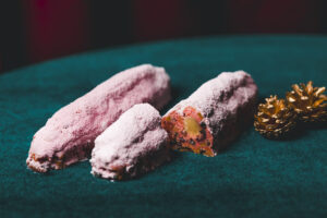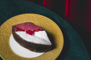 チョコレートフレーバーのしっとりガトーショコラを唇型「ビズビズ」の形でご用意。デコレーションはピンク色のアイシングと粉砂糖でクリスマス仕様に。少しビターな味わいのガトーショコラの中はしっとりとした味わいで、アルコールにも合うケーキとしてお楽しみいただけます。