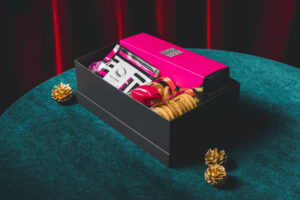 チョコレートフレーバーのしっとりガトーショコラを唇型「ビズビズ」の形でご用意。デコレーションはピンク色のアイシングと粉砂糖でクリスマス仕様に。少しビターな味わいのガトーショコラの中はしっとりとした味わいで、アルコールにも合うケーキとしてお楽しみいただけます。