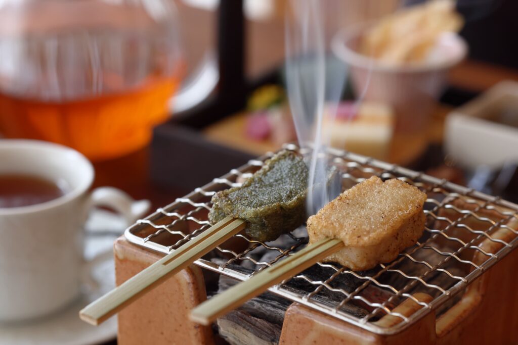 京都の伝統食材「京生麩」を、七輪で焼くことで外は香ばしく、内はもちもちとした食感が楽しめます。料理長特製の3種の漬けだれには、京都の厳選素材を使用。「ねぎ味噌」と「とり味噌」には新宮川町「山利商店」の味噌、「醤油麴」には澤井醤油本店の醤油を使用し、京生麩の素朴な味わいと絶妙に調和します。お客様専用の七輪で、自分好みの焼き加減をお楽しみください。