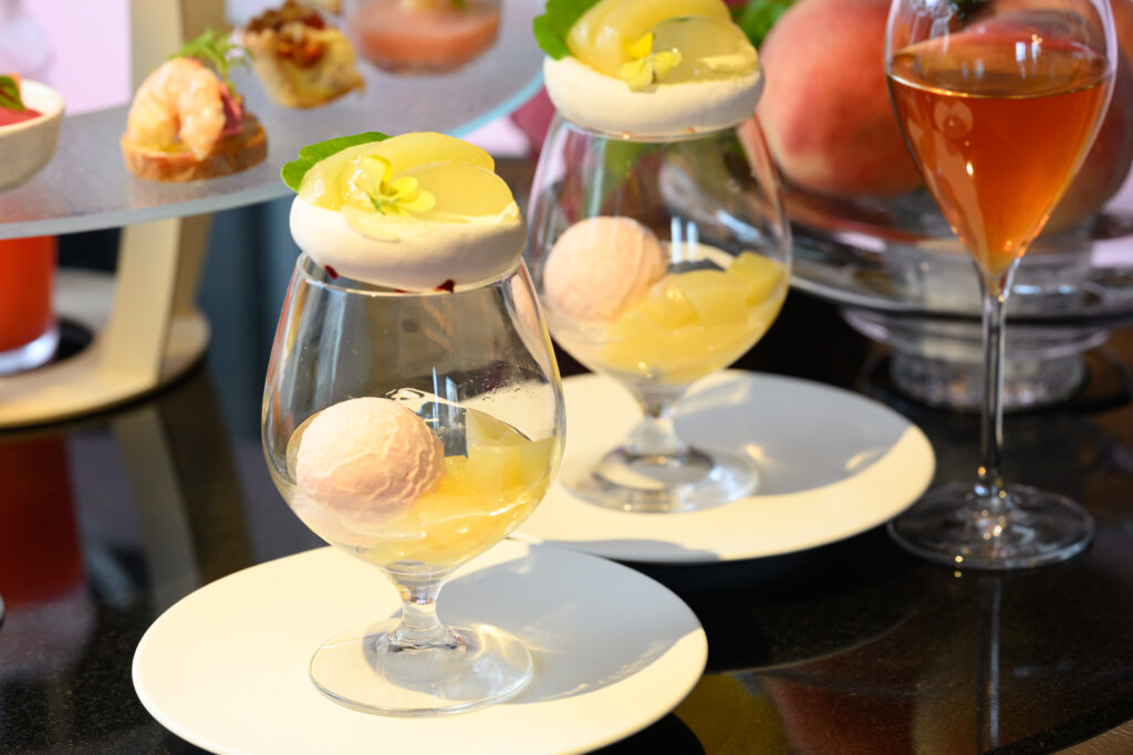「紀の里の桃」を使用した前半のピーチバージョンと後半のシャインマスカットバージョンを楽しめるみずみずしい夏のアフタヌーンティーのご提供を7月20日(日)より開始いたします。